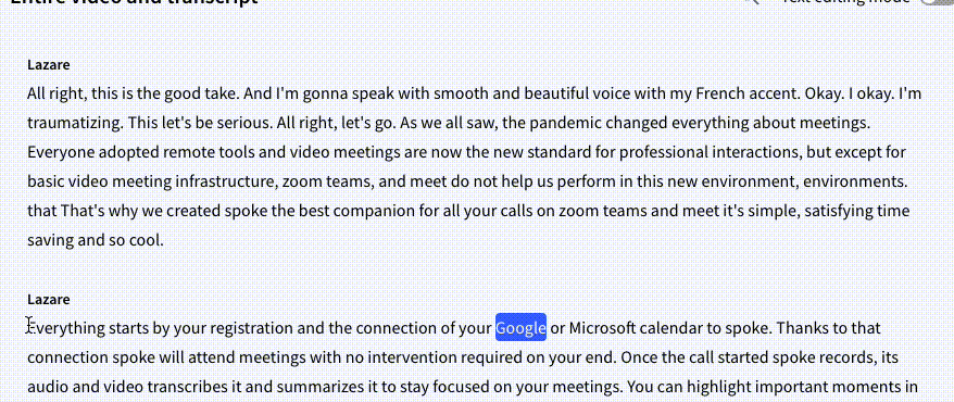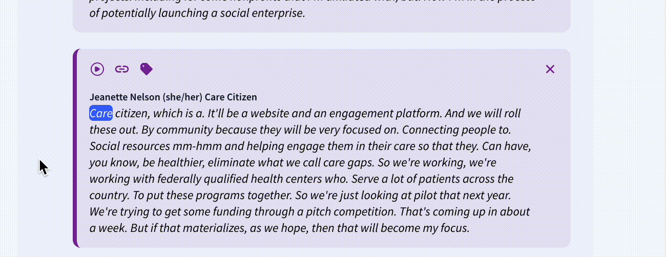 Once in the meeting, highlight interesting or important moments live in the user interface with the Highlight Moment feature to keep track of key quotes or questions simply by highlighting text.