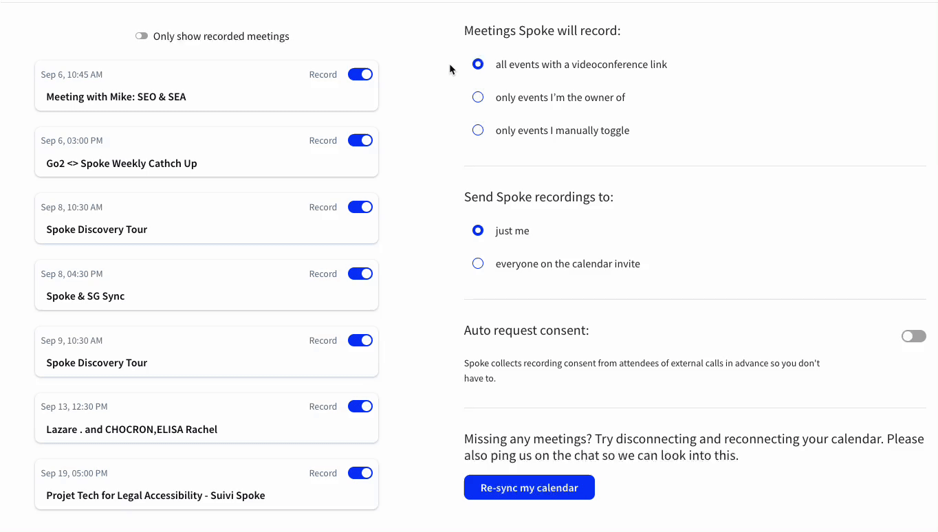 Configure which meetings you'd like recorded by default and also rename your meeting companion to something more personal (nobody likes an anonymous robot!). You can set to either record all your meetings, just the ones you are the owner of, or none by default:
